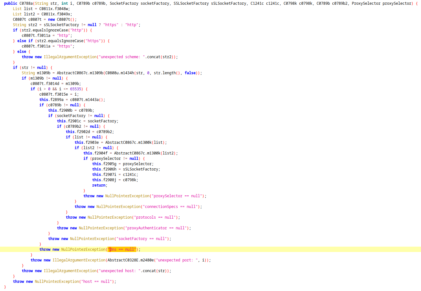 There is a function C0788a that creates a complete network object, probably to configure the entire network connection of an HTTP/HTTPS client in order to encapsulate a web browser or WebView for Spotify, which we will see later.