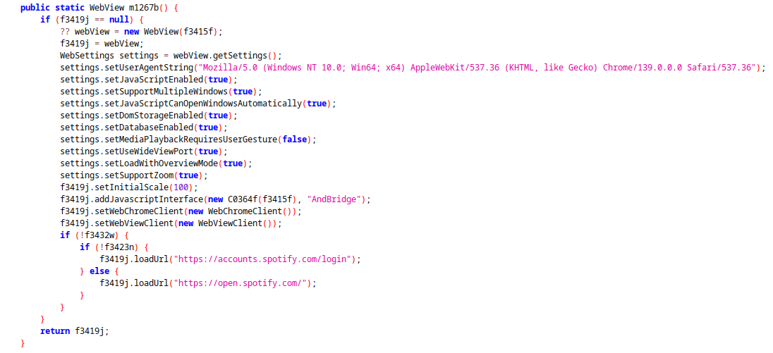 Finally, there is a condition that calls the loadUrl function to the official Spotify website. The condition is probably used to check whether the user is already logged in or not. The two variables f3432w and f3423n are Booleans.